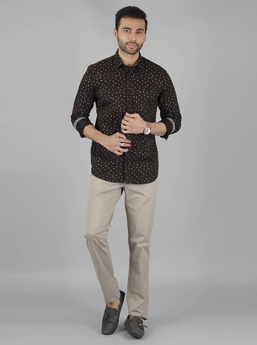 Details: Sport a fashion-forward look when you step out wearing this dark olive printed shirt. This cotton slim fit shirt features classic collar, chest pocket and contrast cuffs. Team it with light grey trousers and moccasins.